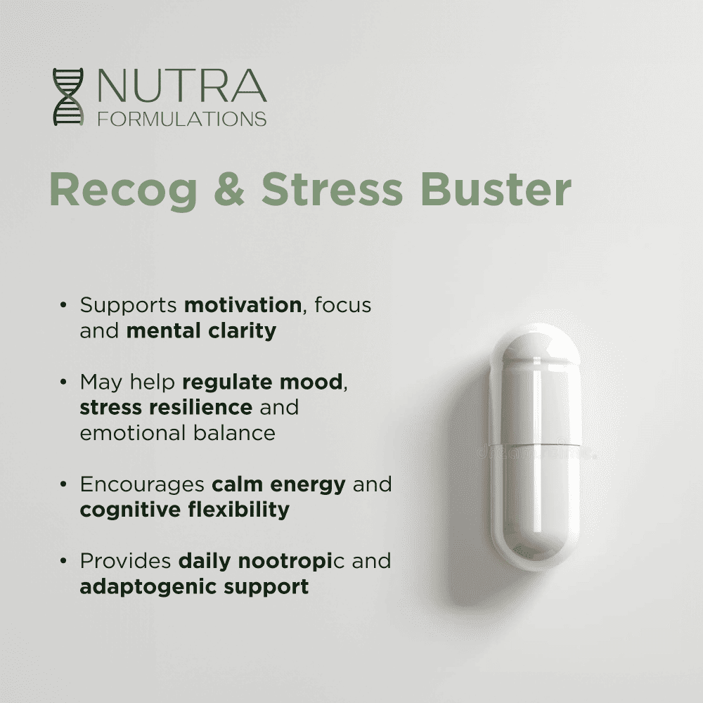• Recog – Contains Bromantane (50 mg) and methyl 9‑MBC (15 mg), two research compounds studied for their potential effects on dopaminergic tone, mental energy and neuroplasticity*